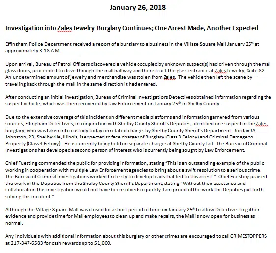 Effingham, Il – In an update to Unknown Driver Crashes Into Zales Inside Village Square Mall, At approximately 3:15 p.m., Effingham Police Department Confirmed the arrest of Jordan JA Johnson, 23, of Shelbyville, Il.