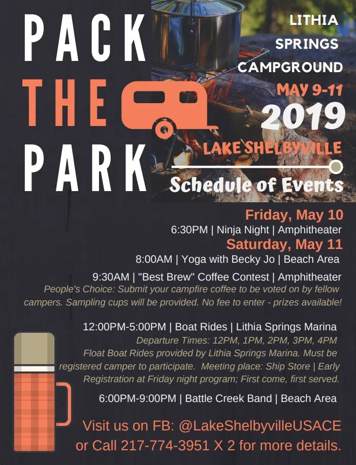 For additional information regarding Lithia Springs Pack the Park, please contact our Lake Shelbyville USACE Project Office at (217)774-3951 X 2.