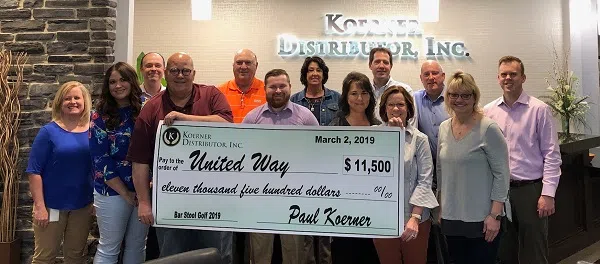 EFFINGHAM, IL-(Effingham Radio)- Koerner Distributor, Inc. presented a check to the United Way of Effingham County in the amount of $11,500 for funds raised during the 2019 Annual Barstool Golf fundraiser that was held on March 2nd and was sponsored by Koerner Distributor.