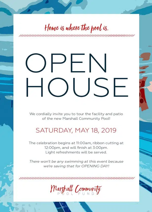 Please join us at the Open House for this historic moment in Marshall at the Marshall Community Pool. Plan on touring the bath house, patios, and enjoying music, and light refreshments provided by Chick-FIL-A and Lisa’s Bakery. We won’t be swimming at this event because we are waiting to swim on OPENING DAY!!