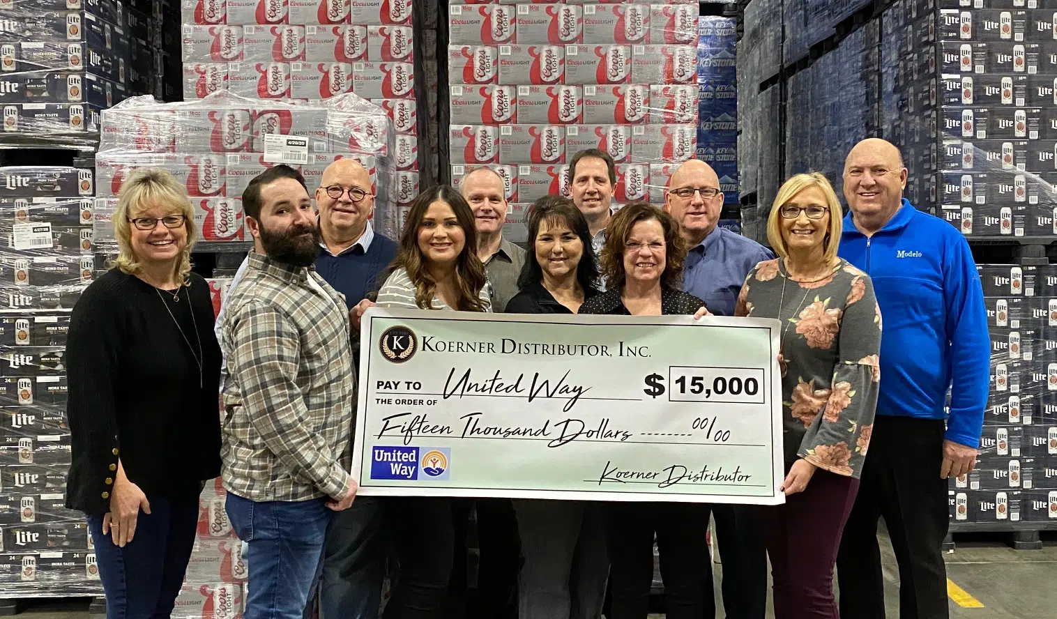 Peggy Valenti and employees of Koerner Distributor, Inc., presented a check to James Schultz and representatives from United Way of Effingham County.
