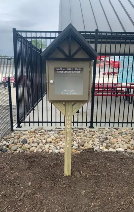 The newest Little Library Outpost is located near the Marshall Pool just inside the Robert Washburn Park.