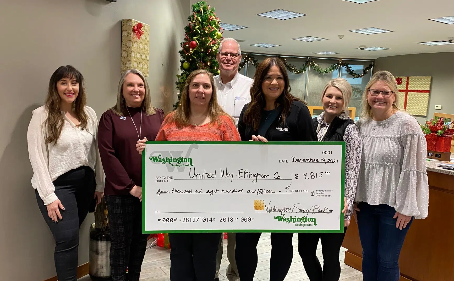 Effingham, IL-(Effingham Radio)- Employees of Washington Savings Bank presented a check to Lora Bergfeld and members from United Way of Effingham County.