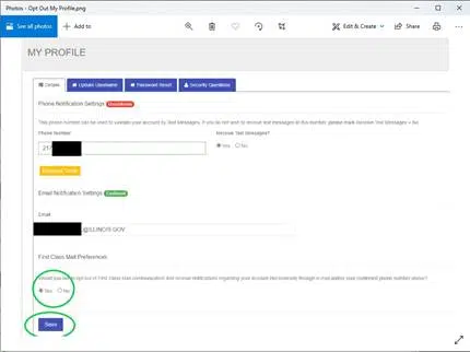 Once there, the individual simply ensures they have a phone number and/or email address entered in the spaces provided, then selects “Yes” at the bottom of the page where it asks if an individual would like to opt out of First-Class Mail communication. Then click, “Save.”