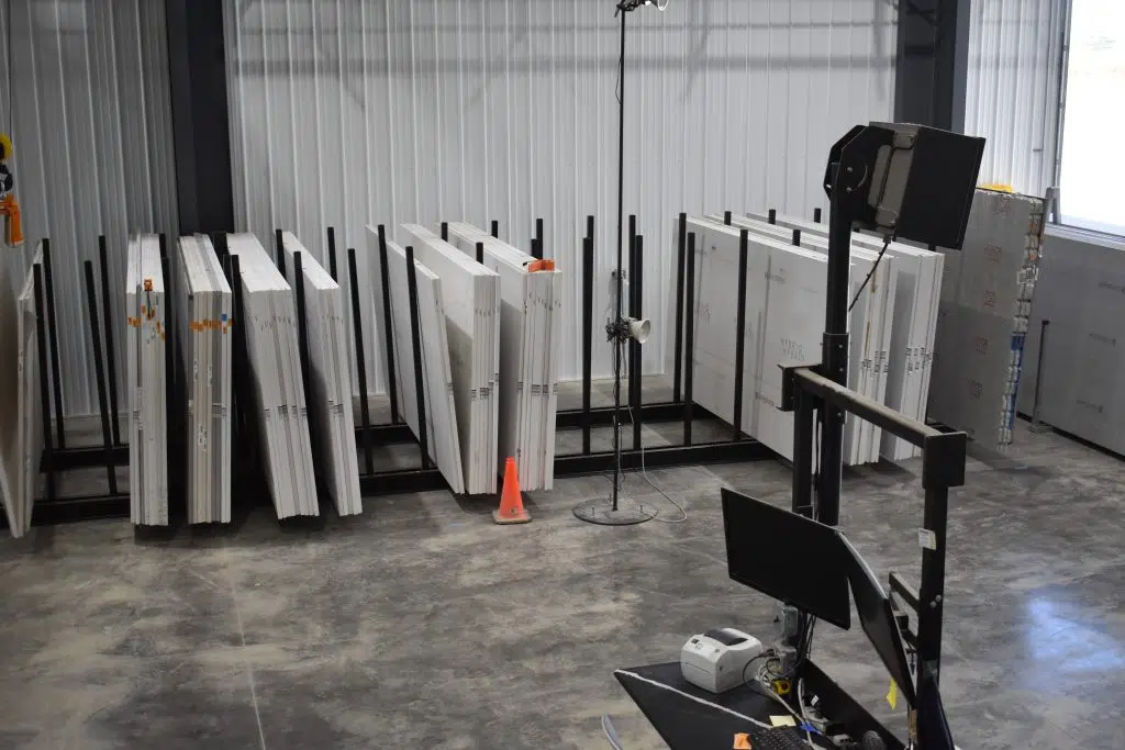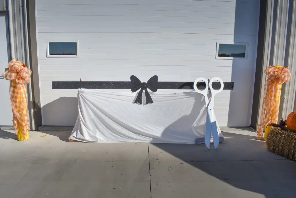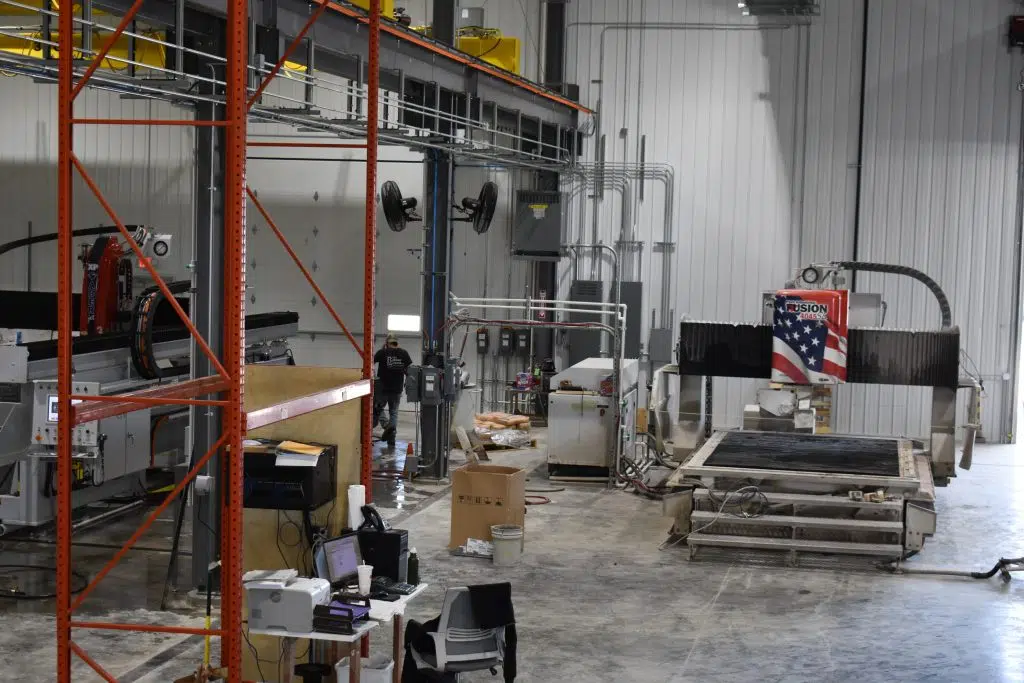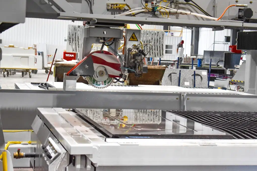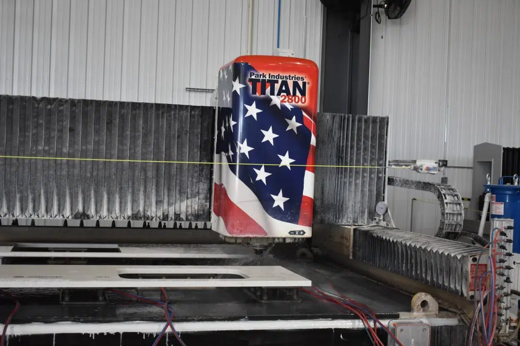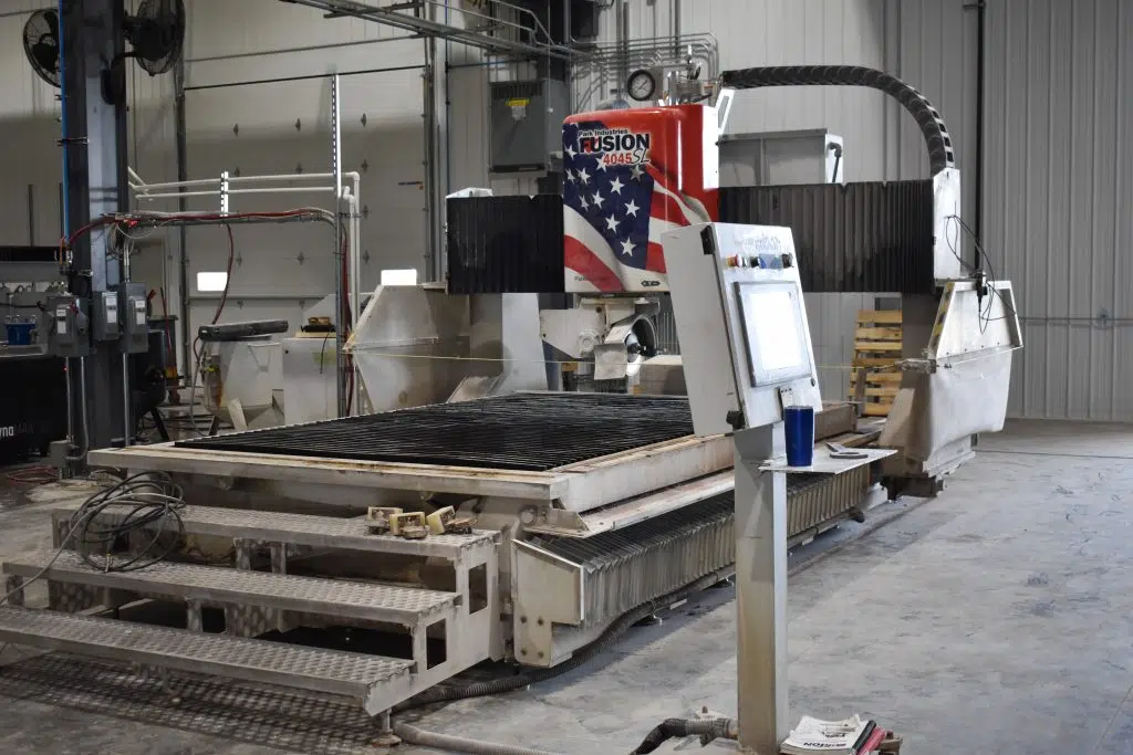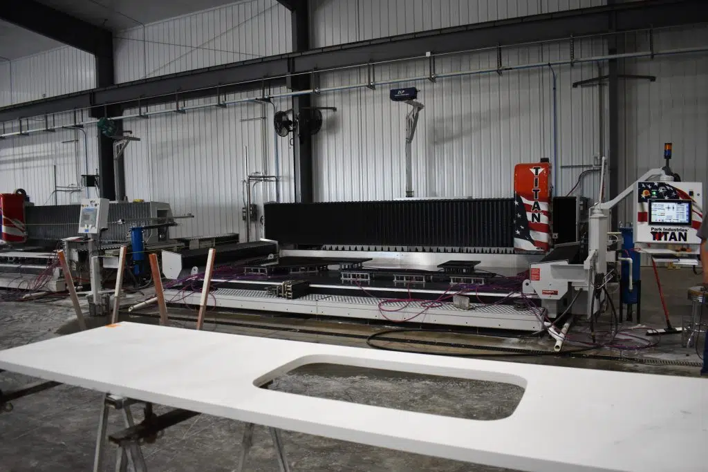 Members of the Mette team, including Allen, Bob, Julie, and Don were present to cut the ribbon along with members from the Effingham Chamber of Commerce. After the ribbon cutting, the team also presented a ribbon they created out of quartz stone, which was cut on their new dual table SABERjet saw. The woodshop team also joined in the fun by making a large pair of wooden scissors.