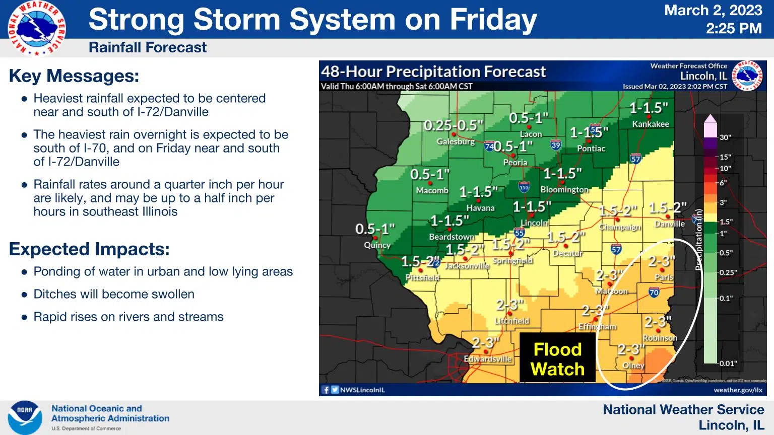 A Flood Watch has been issued for the counties of Edgar, Clark, Jasper, Crawford, Clay, Richland, and Lawrence, including the cities of Paris, Flora, Newton, Robinson, Lawrenceville, Marshall, and Olney through Friday evening.