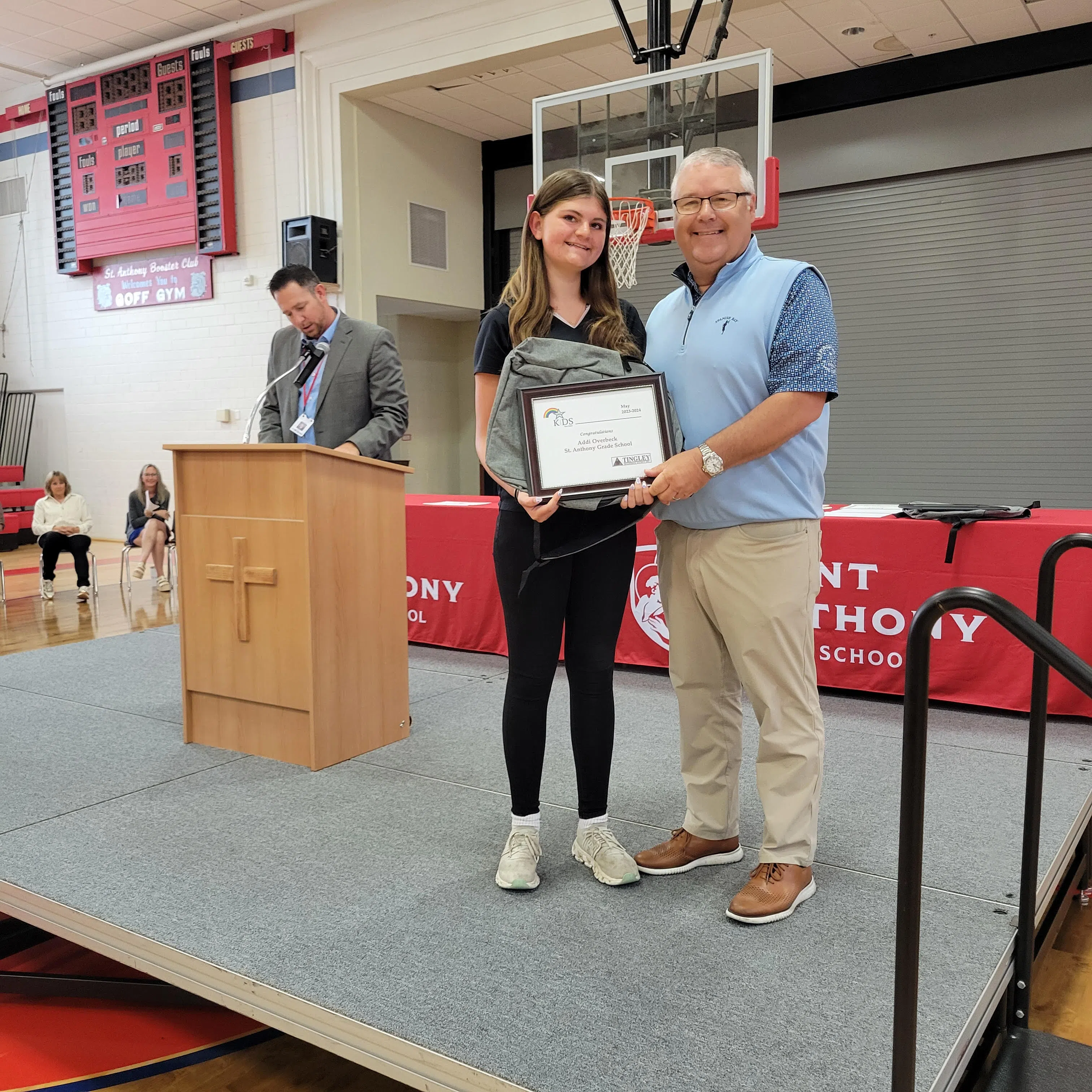 Making the announcement at St Anthony Junior HS is Cody Rinker, principal. Tingley Insurance supports Addie & all our area youth to achieve their goals.