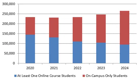 The new report shows more students are returning to the classroom in 2024. Online students, defined as students taking at least one online course, accounted for 35.6 percent of the overall student population in Fall 2024 compared to Fall 2023, when online student enrollments represented 42.3 percent of all students, in Fall 2022 represented 47.3 percent, and in Fall 2021 represented 56.8 percent.