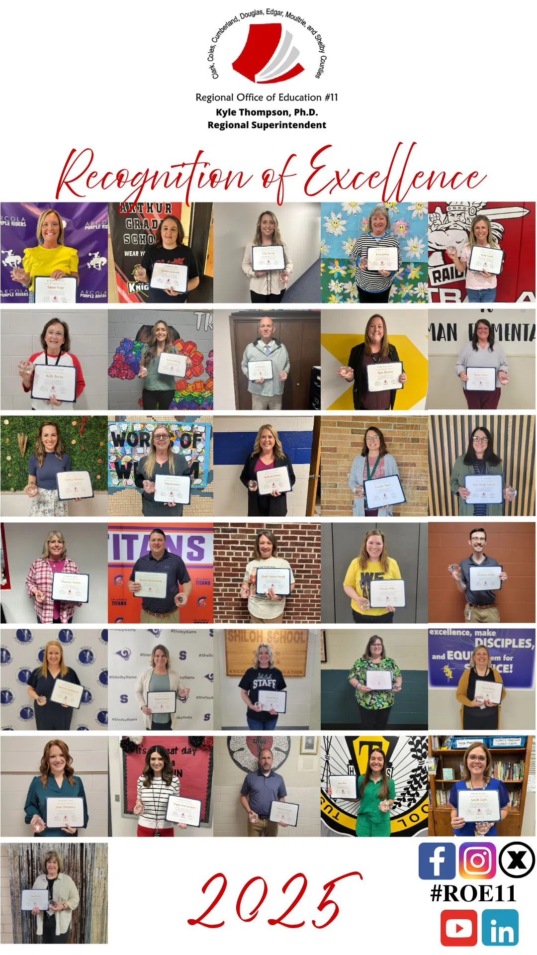 Charleston, IL-(Effingham Radio)- The Regional Office of Education #11 (ROE #11) is proud to announce the recipients of the 2025 Recognition of Excellence Award, honoring outstanding education professionals who exemplify skill, dedication, and an unwavering commitment to inspiring students across the region. Selected from a pool of exceptional nominees, these awardees have earned the respect and admiration of students, parents, and colleagues alike through their leadership, community involvement, and extraordinary ability to ignite a passion for learning in students of all backgrounds and abilities.
