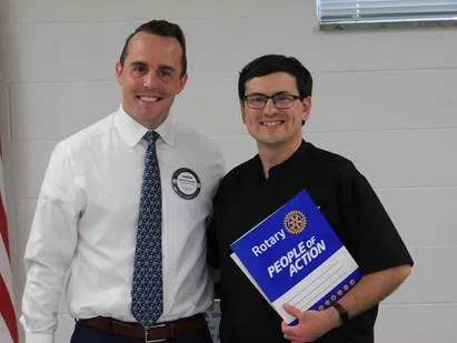 (NOON ROTARY PRESIDENT ANDREW KOESTER AND NEW ROTARIAN JORDAN PEISER)