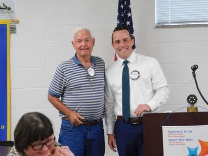 SHOWN ABOVE: NORBERT SOLTWEDEL AND NOON ROTARY PRESIDENT ANDREW KOESTER