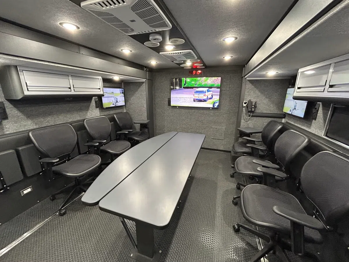The new command vehicle, a 2025 Freightliner, replaces an 18-year-old vehicle with antiquated technology. The new command vehicle is equipped with high-definition cameras and monitors, state-of-the-art communications technology, real-time data access, and dual slide outs for a large conference room. It will serve as a central hub for ISP officers during emergencies such as natural disasters, large-scale accidents, public events, and search-and-rescue operations.