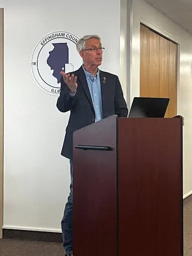 Effingham, IL-(Effingham Radio)- Effingham County Board Chairman Josh Douthit recently hosted Illinois State Representative of the 107th District Brad Halbrook. Representative Halbrook spoke directly to Effingham County elected officials and department heads about the problems facing Illinois and those issues discussed in Springfield, IL. Representative Halbrook was kind enough to visit Effingham County after recently working long into the night in Springfield as the budget was passed by Illinois legislatures.
