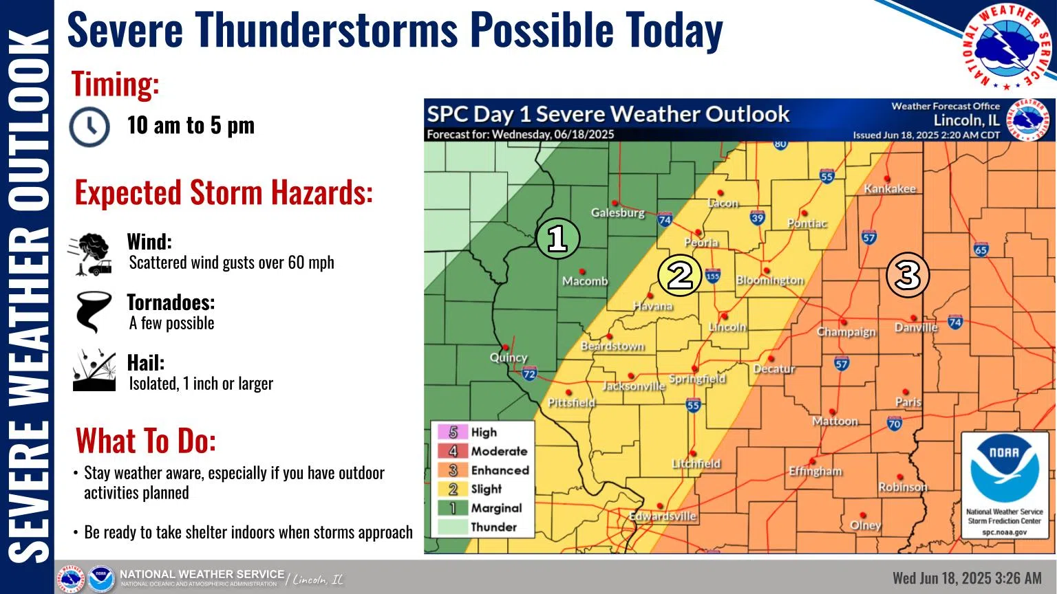 There is a risk of severe thunderstorms from mid morning through late afternoon today across central and southeast Illinois, especially east of I-55 where there is an Enhanced, or level 3 of 5, Risk for severe storms. The primary severe weather threat is scattered wind gusts over 60 mph, however a few tornadoes and isolated large hail are possible as well. Severe weather threats look to begin around 10 AM as a disturbance moves into the area, and diminish after 5 PM.