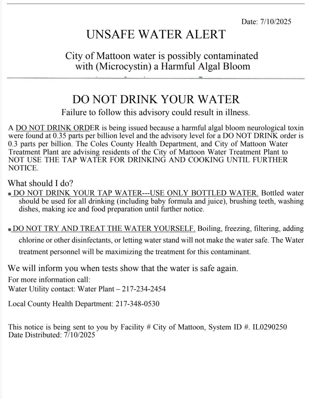 The algae in Mattoon water is Microcystin. Mattoon had a level of .35. The dermal limit (what’s safe for skin) is 1.6 for adults and .3 for children. We are still looking for answers – is it safe to wash clothes / hair / bedding. We have not answered those questions due to the conflicting information.