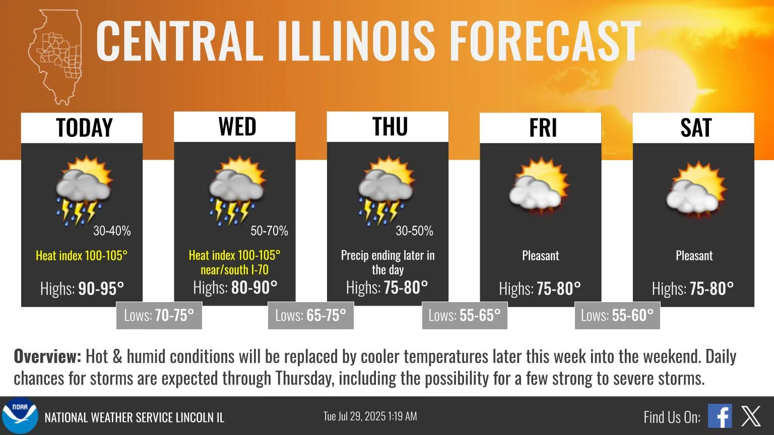 Hot and humid conditions will be replaced by cooler temperatures for the end of the week into the weekend. Daily storm chances will be seen through Thursday, including the threat for a few strong to severe storms.