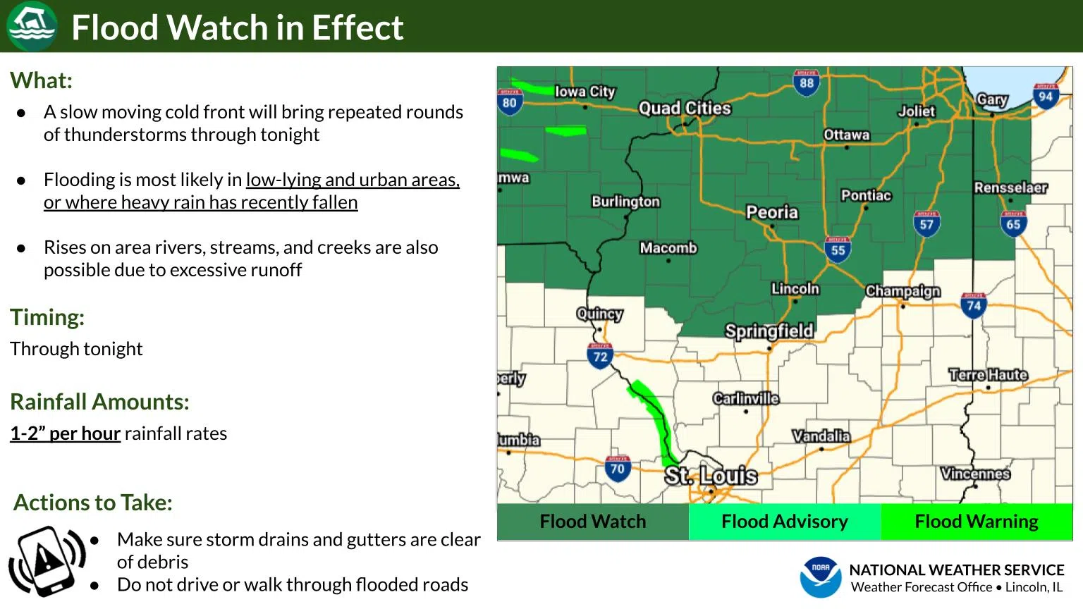 Repeated rounds of storms could result in flooding of low-lying and urban areas, or where heavy rain has recently fallen. A Flood Watch is in effect for a handful of counties in central Illinois through tonight.