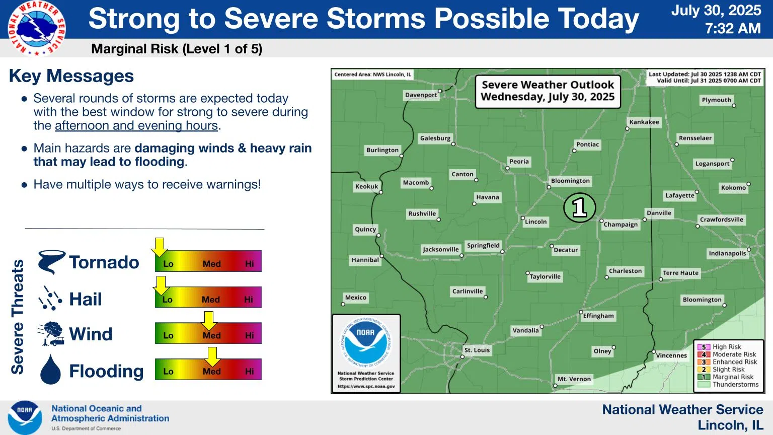 Periods of storms will be common today, with a few strong to severe storms possible this afternoon into evening. A line of showers and storms will track east at 30 mph, affecting much of central IL into early afternoon. Expect heavy downpours, frequent cloud to ground lightning, and isolated 30-50 mph wind gusts.