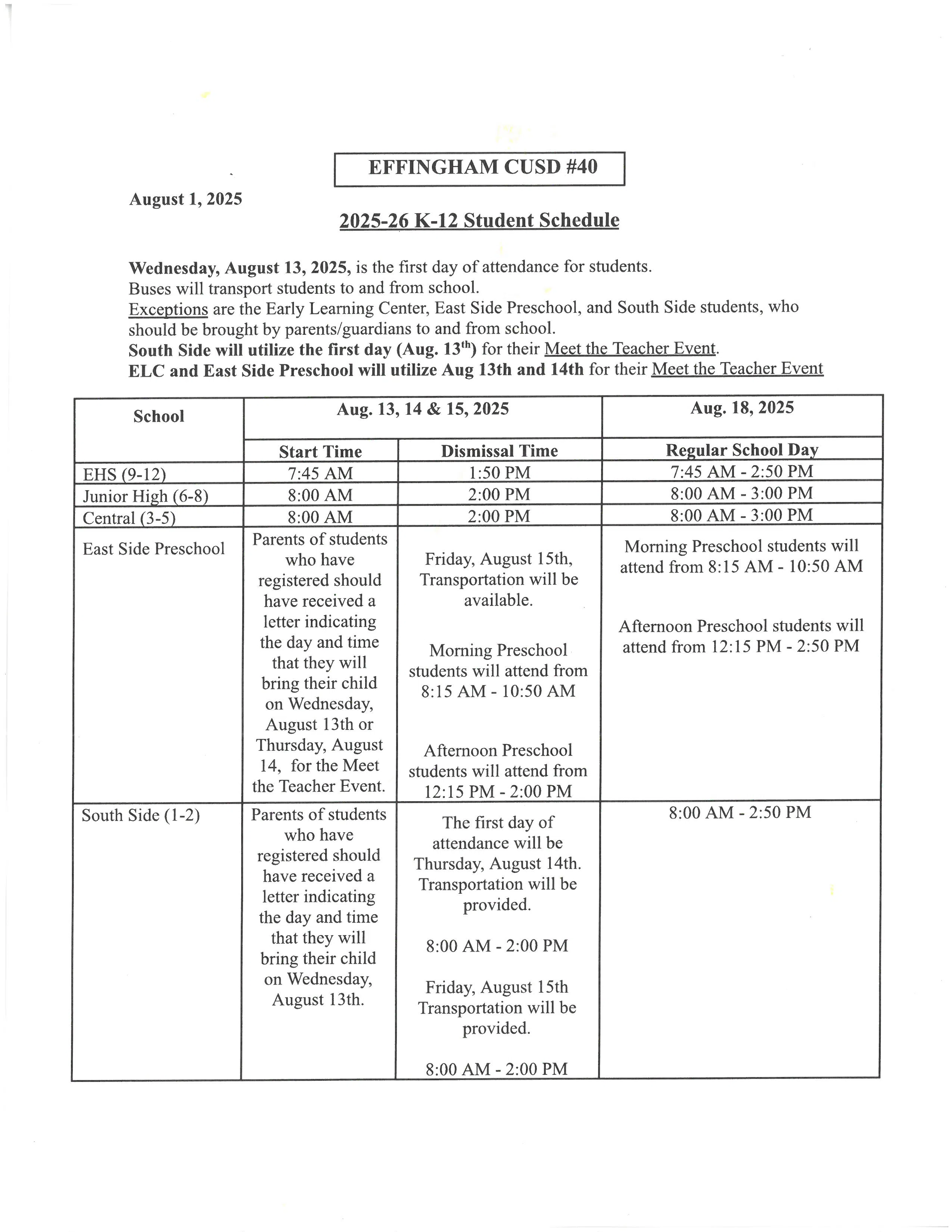 Effingham, IL-(Effingham Radio)- The Effingham Unit 40 School District has announced the opening day schedule for students. August 13th is the first day back from summer vacation.
