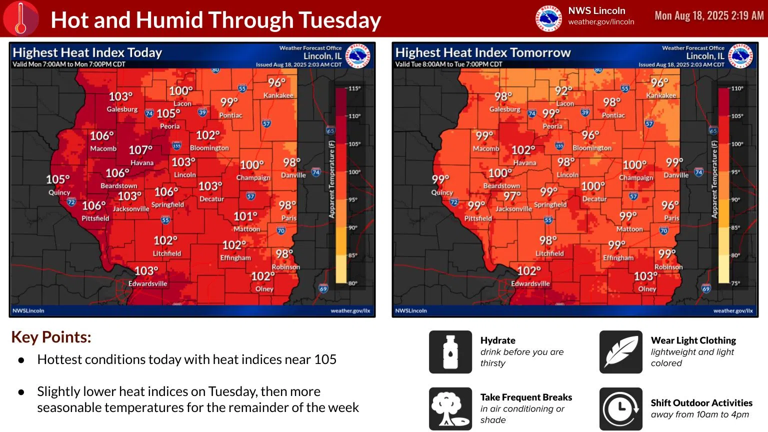 HEAT ADVISORY REMAINS IN EFFECT UNTIL 8 PM CDT THIS EVENING... * WHAT...Peak afternoon heat index values 100 to 105 degrees. * WHERE...Portions of central, east central, southeast, and west central Illinois. * WHEN...Until 8 PM CDT this evening. * IMPACTS...Hot temperatures and high humidity may cause heat illnesses. PRECAUTIONARY/PREPAREDNESS ACTIONS... To reduce risk during outdoor work, the Occupational Safety and Health Administration recommends scheduling frequent rest breaks in shaded or air conditioned environments. Anyone overcome by heat should be moved to a cool and shaded location. Heat stroke is an emergency! Call 9 1 1. If you do not have air conditioning in your home or lack shelter, you can call 211 or visit keepcool.illinois.gov for assistance locating appropriate shelter from the heat.