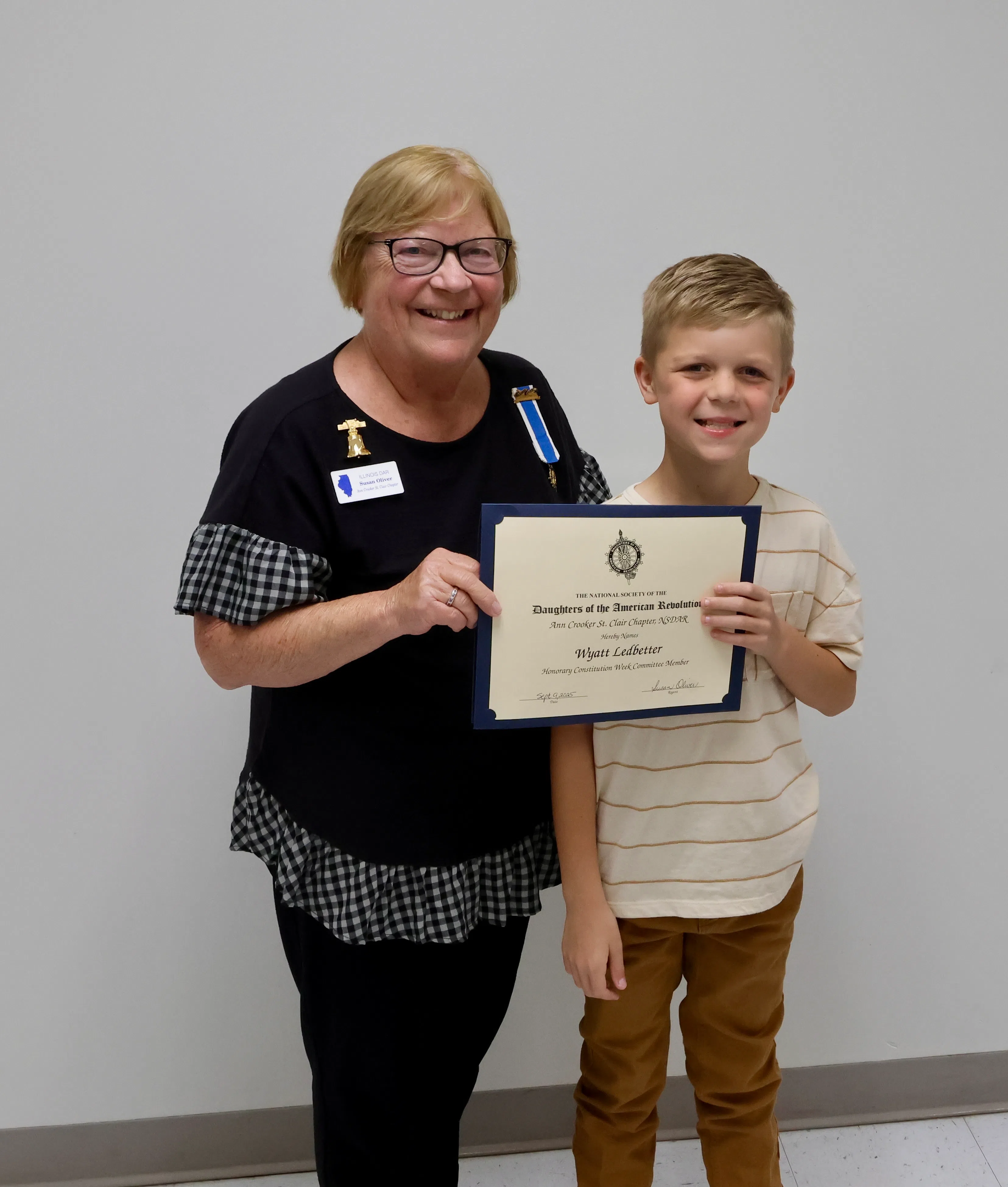 At our September meeting, with guests that included the Illinois State Regent, a Honorary State Regent, and the District VI Director, the chapter gave Wyatt Ledbetter a certificate making him an Honorary Constitution Week Committee member.