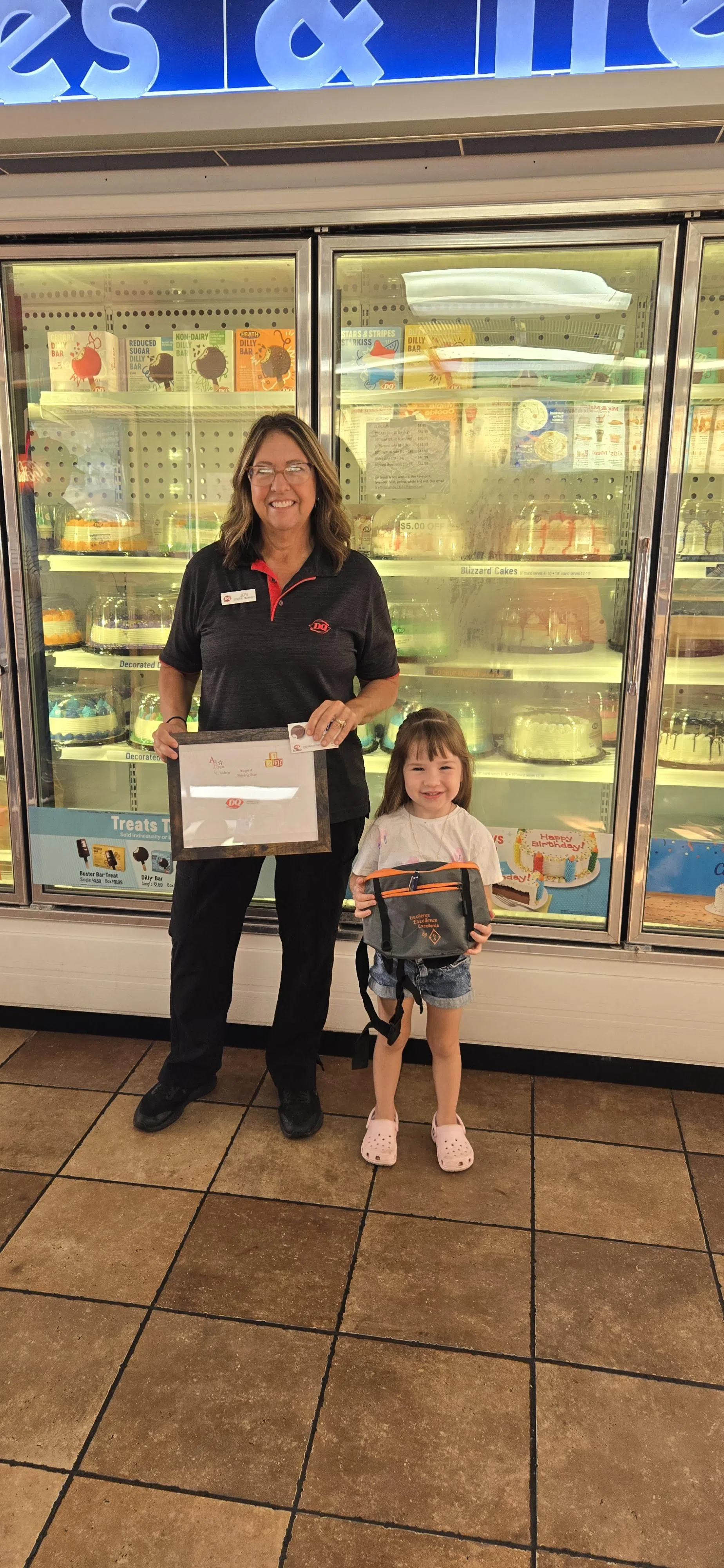 Nora is Pictured with DQ manager Geri Bland while receiving her certificate of recognition and gift from them.