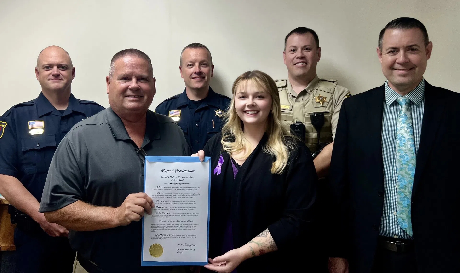 Effingham, IL-(Effingham Radio)- Mayor joined other supporters of domestic violence awareness, stating that domestic violence is a community problem and it takes a community working together to eradicate intimate partner violence.