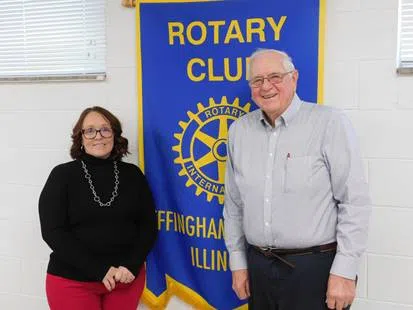 (ROTARY WEEKLY PROGRAM CHAIRMAN BETH DEBOLT AND EFFINGHAM COUNTY FAIR BOARD PRESIDENT PHIL HARTKE)