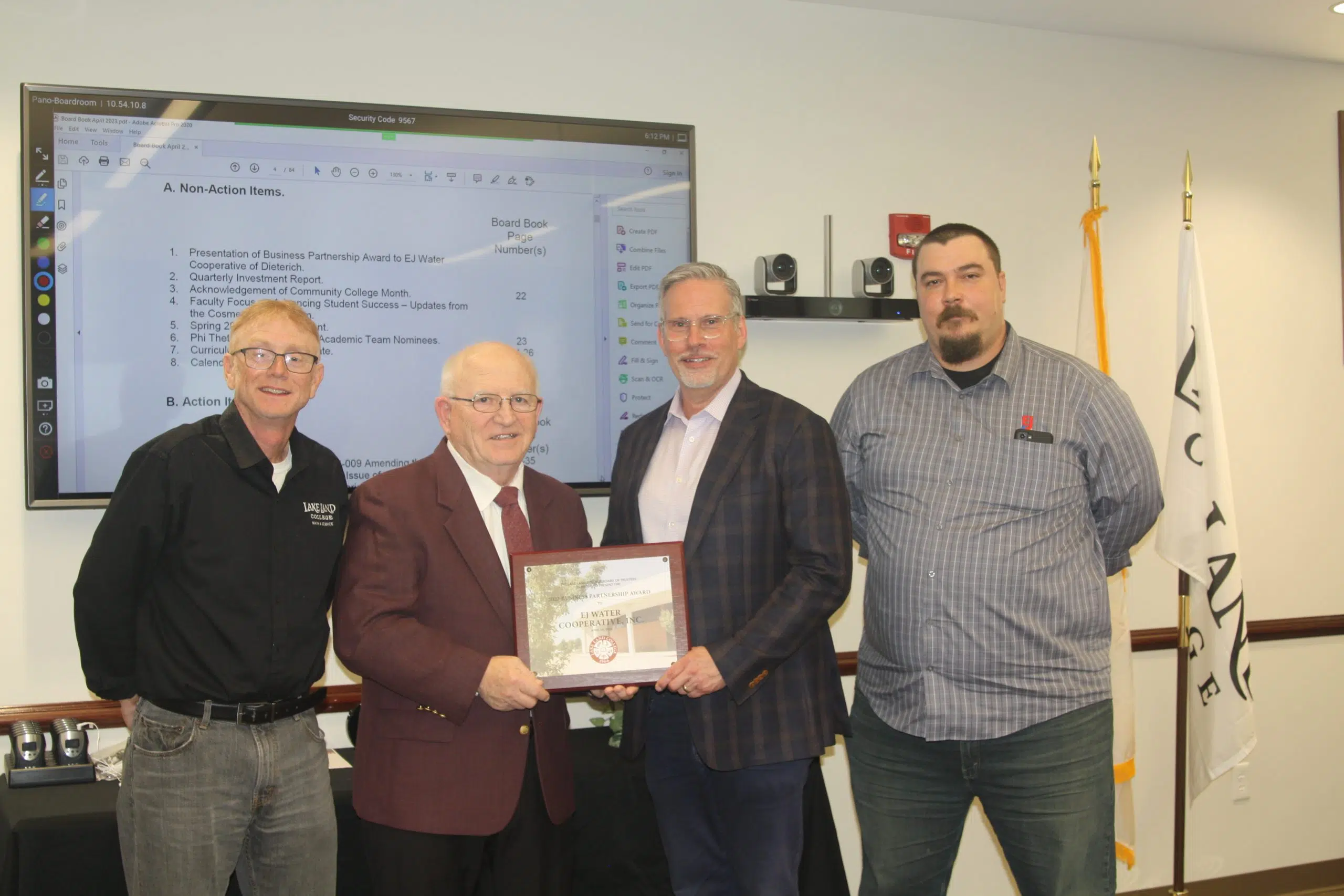 Effingham, IL-(Effingham Radio)- Lake Land College presented the 2023 Business Partnership Award to EJ Water Cooperative of Dieterich at the regular board of trustees meeting April 10.