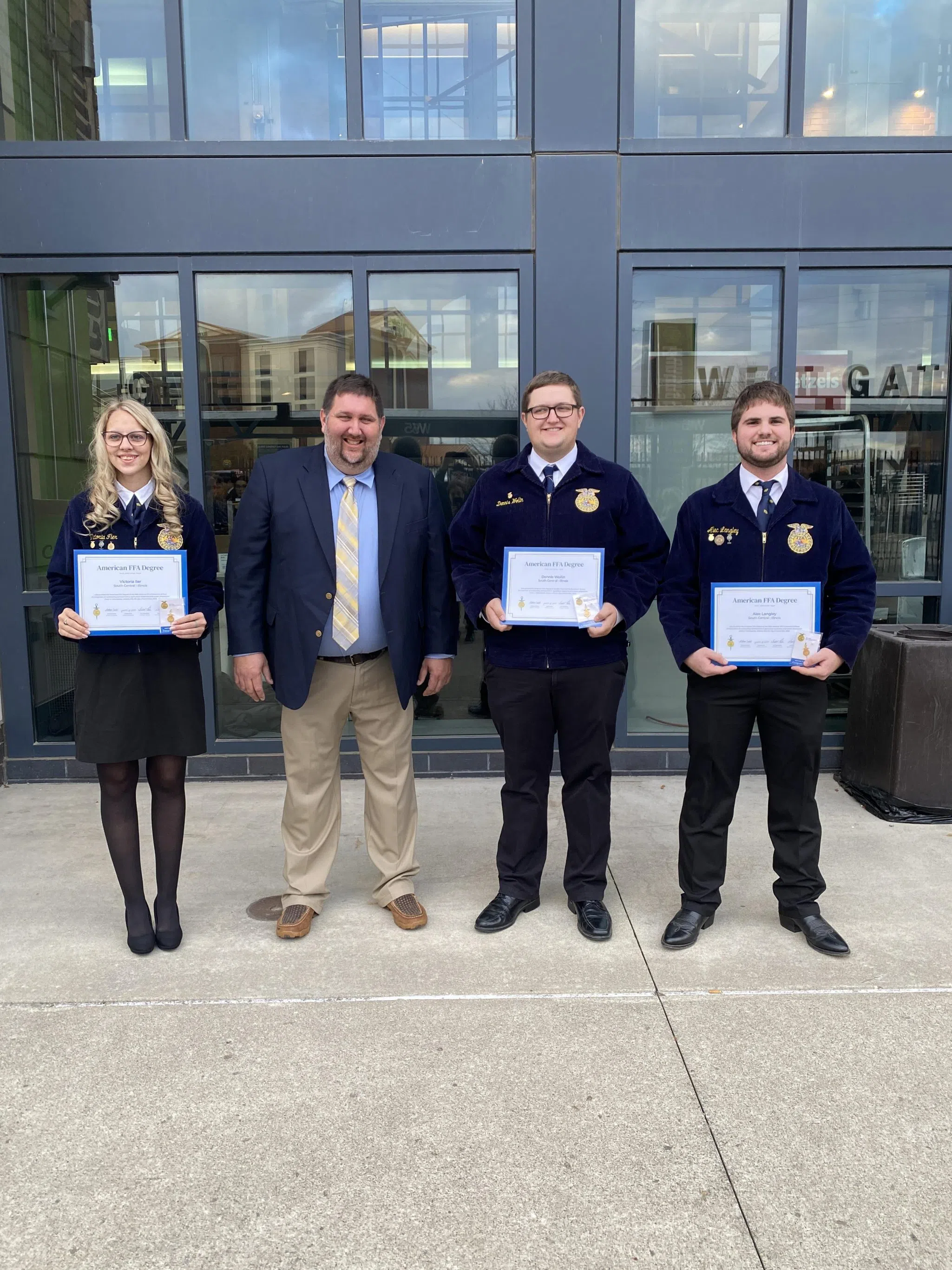 To obtain this degree one must have received their State FFA Degree, complete three years of secondary instruction in an agricultural education program, one year of enrollment in a postsecondary agriculture program, earned at least $10,000 and productively invested $7,500 through the Supervised Agriculture Experience, have an scholastic record of a C or better, 50 hours of community service, and have a record of outstanding leadership. We are very proud of Alec Langley, Dennis Wollin, and Victoria Iler for this big accomplishment.