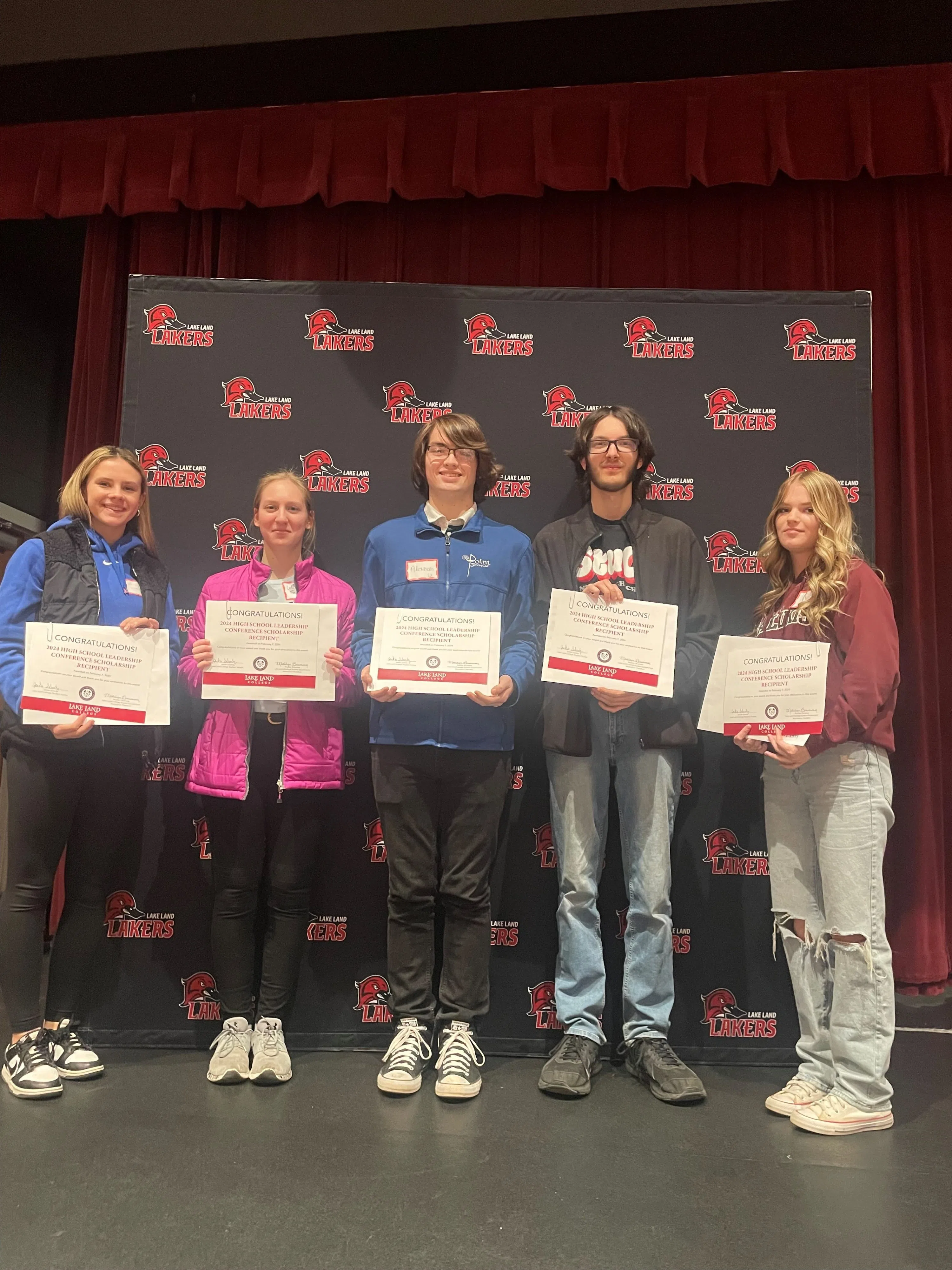 At left, Kelsey Moore, Arcola; Lillian Simpson, Pana; Alexziah Hagler, Shumway; Dylan Kenworthy, Neoga and Payton Laramore, Ramsey, at the 2024 High School Leadership Conference at Lake Land College. The five students each won a 3-credit-hour tuition waiver during the conference.
