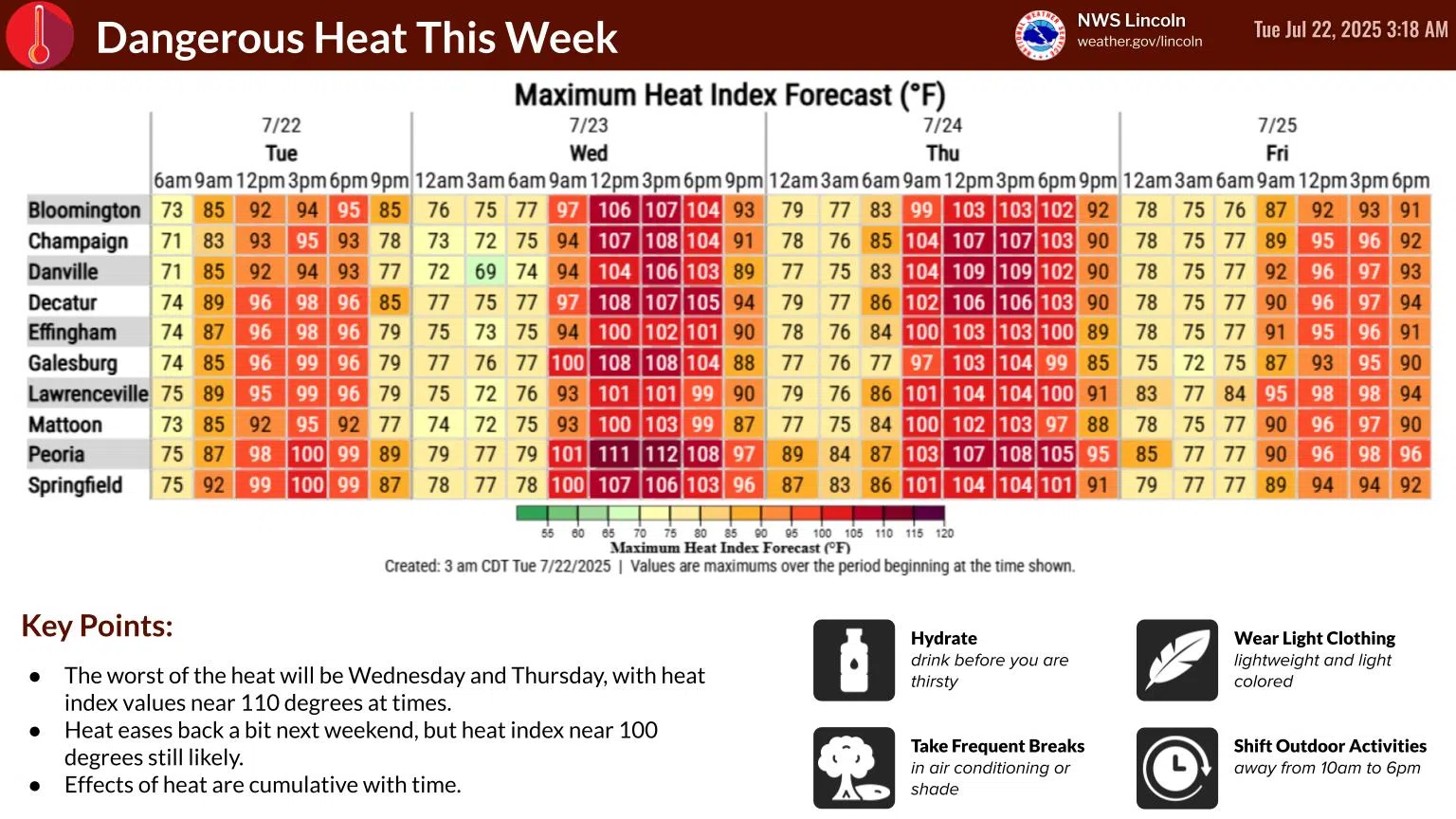 HEAT ADVISORY IN EFFECT FROM 10 AM WEDNESDAY TO 7 PM CDT THURSDAY... * WHAT...Heat index values 100 to 105 degrees expected, locally up to 110. * WHERE...Portions of central, east central, and southeast Illinois. * WHEN...From 10 AM Wednesday to 7 PM CDT Thursday. * IMPACTS...Hot temperatures and high humidity may cause heat illnesses. PRECAUTIONARY/PREPAREDNESS ACTIONS... To reduce risk during outdoor work, the Occupational Safety and Health Administration recommends scheduling frequent rest breaks in shaded or air conditioned environments. Anyone overcome by heat should be moved to a cool and shaded location. Heat stroke is an emergency! Call 9 1 1.