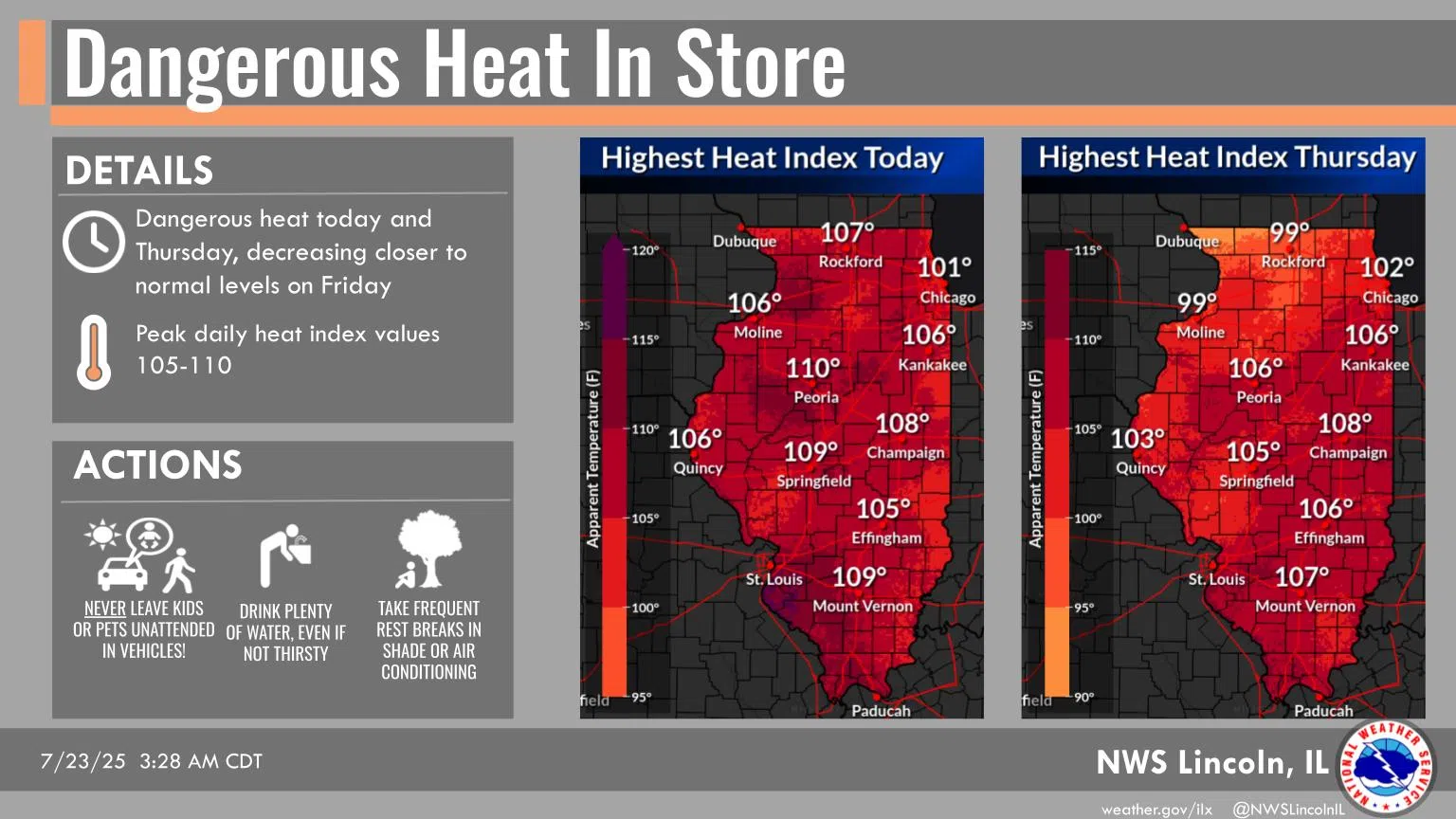 Dangerous heat is in store through Thursday. Expect heat index values of 105 to 110 across central and southeast Illinois today and Thursday afternoon. Never leave kids or pets unattended in vehicles, drink plenty of water, and take frequent breaks in shade or air conditioning.