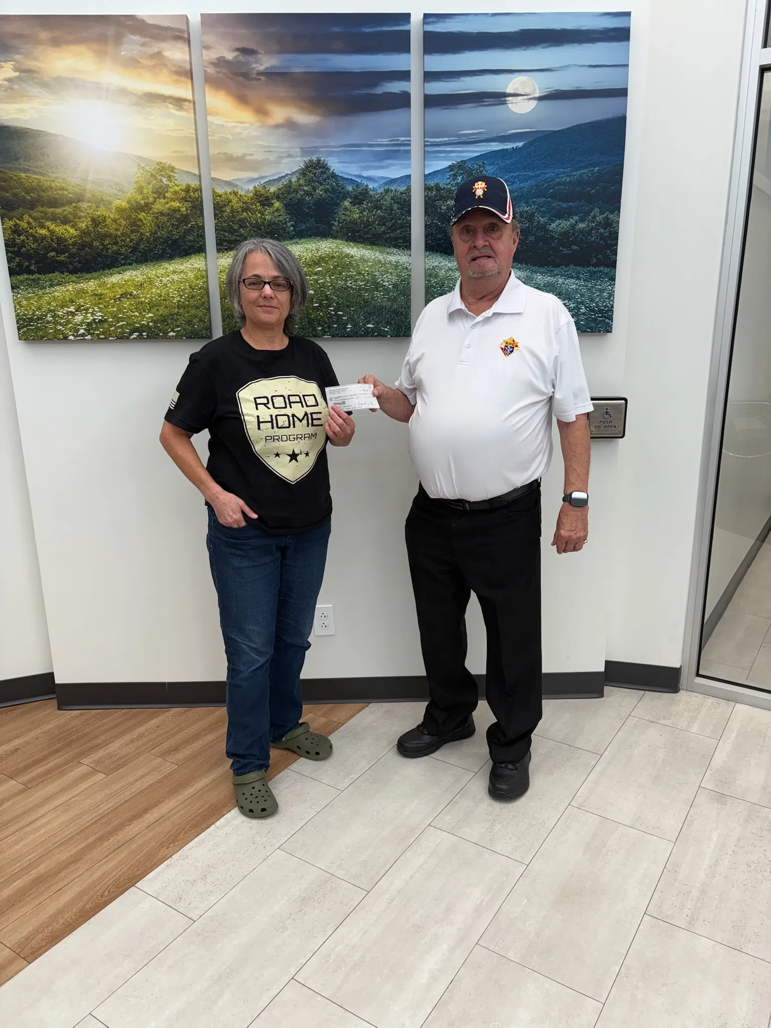 Effingham, IL-(Effingham Radio)- Effingham Knights of Columbus Assembly 214 made a $500 donation to the Road Home Program’s Turkey Drop Event for 2025. Receiving the donation from Faithful Navigator, Jack Dowling, is Road Home Program Turkey Drop Coordinator, Patricia McDaniel.