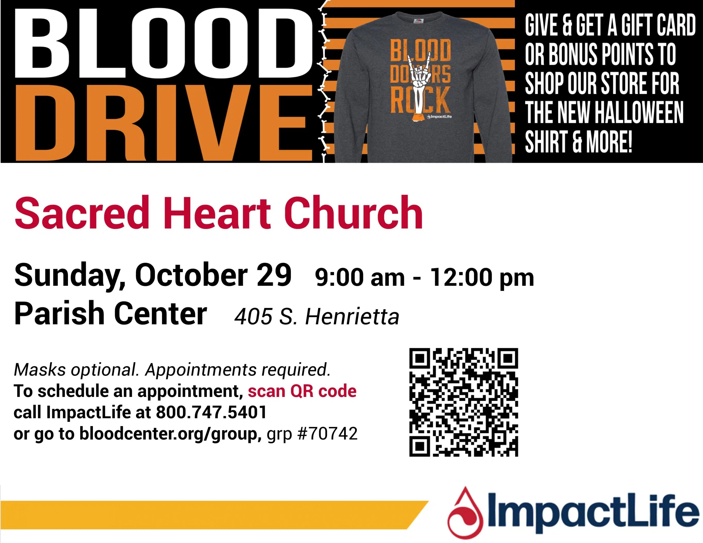 Sacred Heart Church will host a community blood drive with ImpactLife, the provider of blood components for local hospitals. The blood drive will be from 9:00 am to 12:00 pm on Sunday, October 29 at 405 S. Henrietta, inside Parish Center