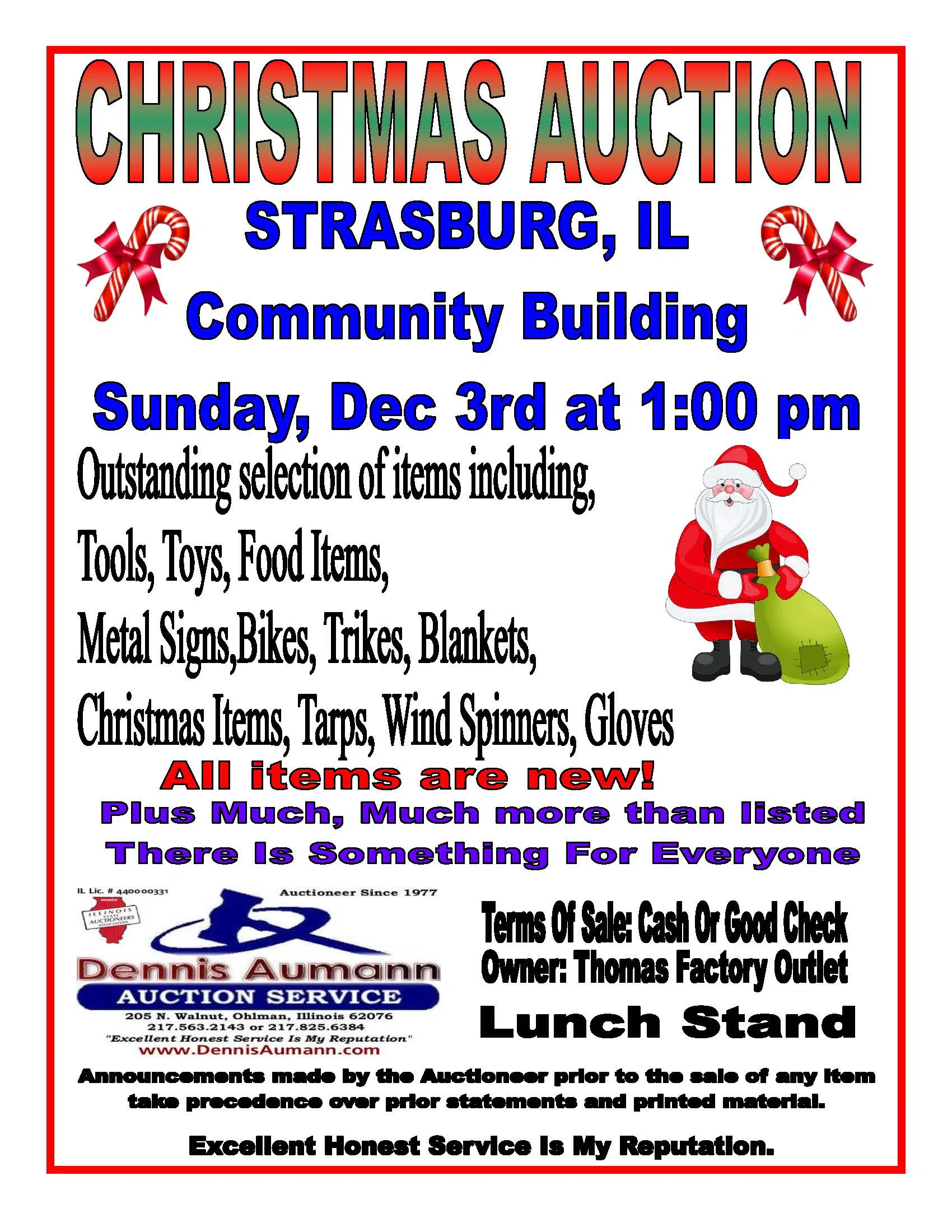 The December Christmas Auction sponsored by Strasburg Liberty Post #289 of the American Legion will be held at 1:00 pm on Sunday, December 3rd at the Community Center in Strasburg. The auction by Thomas Factory Outlet, with Dennis Aumann Auctioneer, is the major fundraiser for the American Legion Post. The Post uses the proceeds from the auction to donate the Annual Easter Egg Hunt, Americanism Essay prize money, Legion Baseball, the Strasburg Veteran’s Memorial, Community Blood Drive, Stewardson-Strasburg Yearbook, Post Prom Activities, and American Legion Gifts to Yanks among other programs.