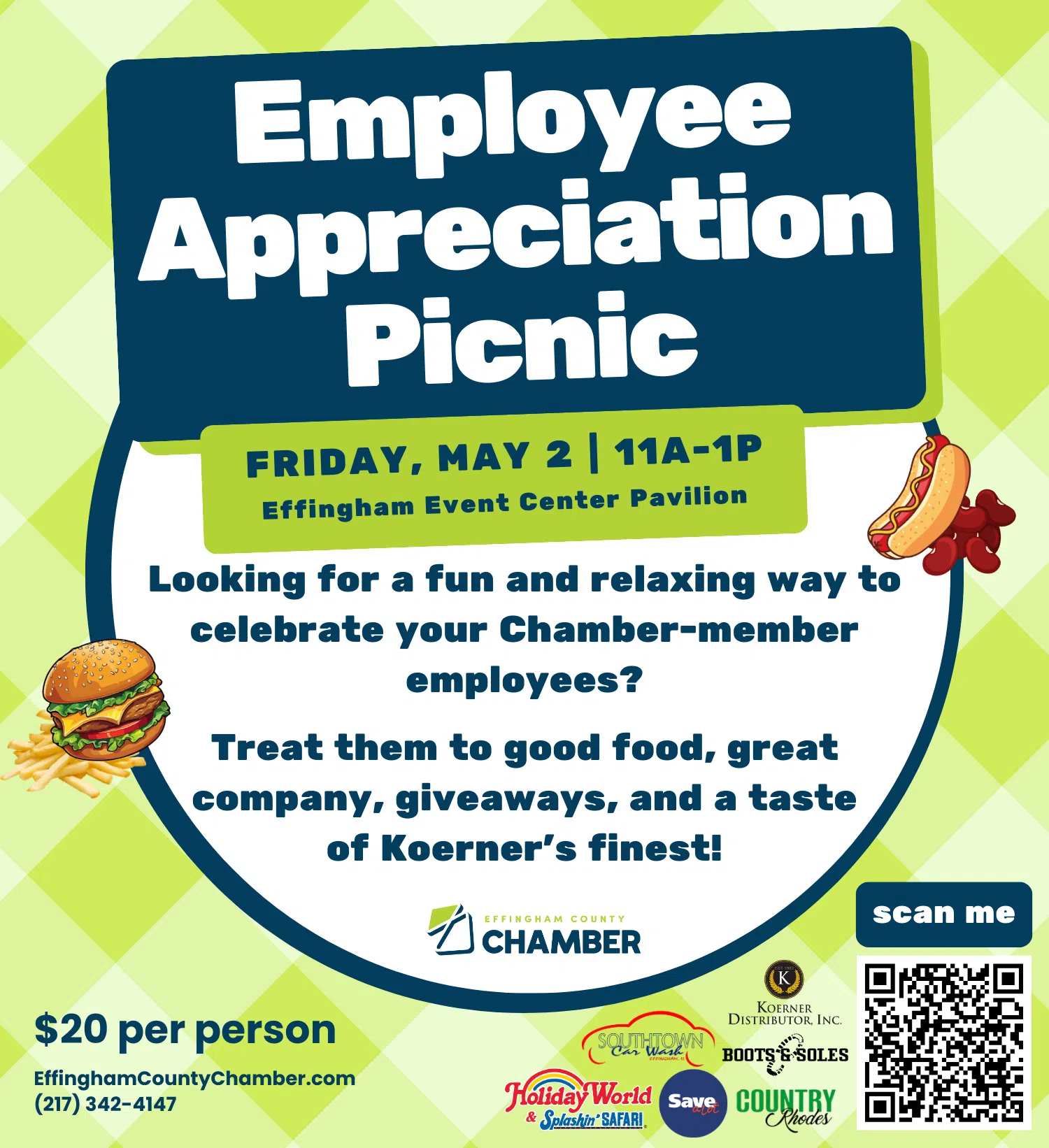 Looking for a way to treat your team? Or just want to start your weekend early with an afternoon of good food and networking? Join us for the Chamber’s Employee Appreciation Picnic on Friday, May 2 from 11a-1p at the Effingham Event Center Pavilion.