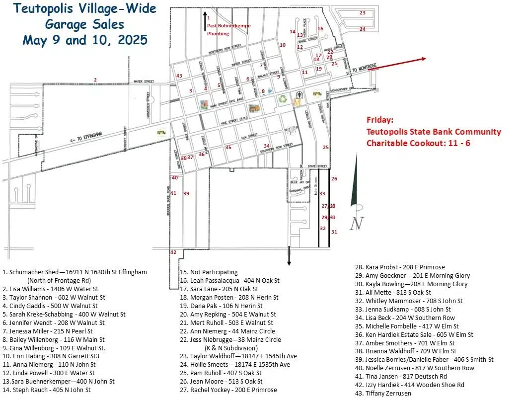 2025 Teutopolis Village Wide Yard Sale May 9 & 10th **We will not be having a food truck this year. The bank is doing their cookout May 9. Find the map post below and add your address to participate by