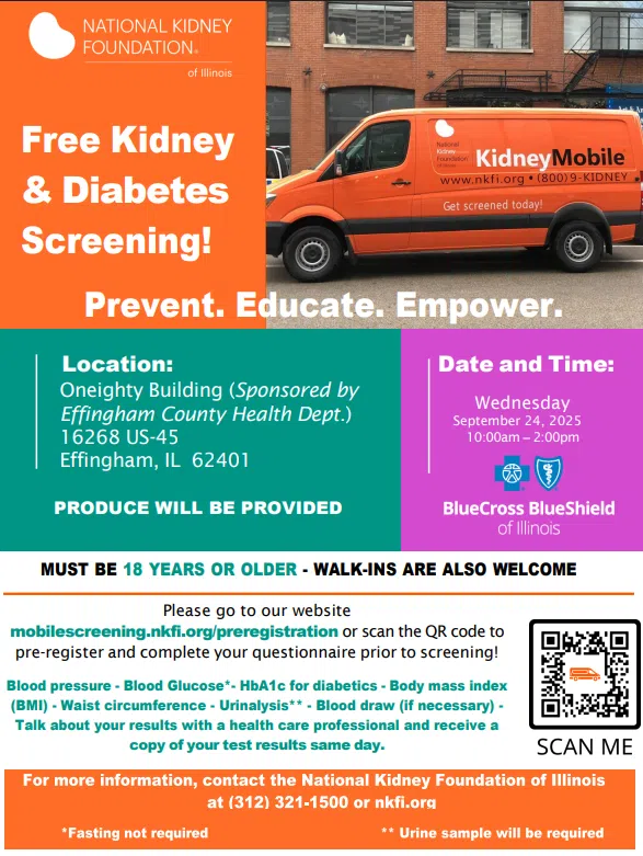 Free Kidney and Diabetes Screening with Free Produce! National Kidney Foundation of Illinois Wednesday September 24, 2025 10:00am – 2:00pm At the : Oneighty Building 16268 US-45, Effingham, Sponsored by Effingham County Health Department MUST BE 18 YEARS OR OLDER – WALK-INS ARE ALSO WELCOME Please go to this website http://www.mobilescreening.