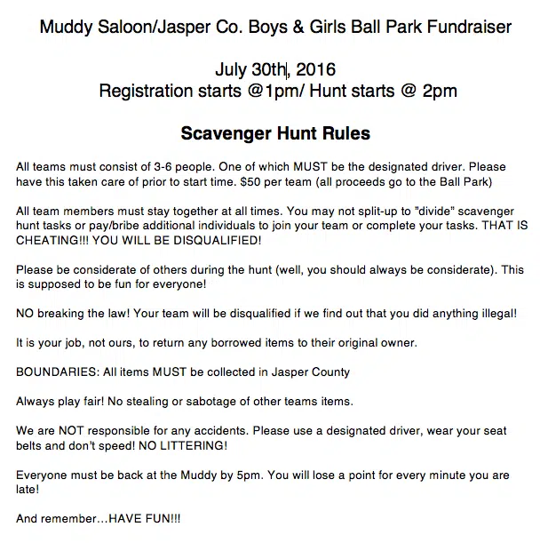 Muddy Saloon/Jasper Co. Ball Park Scavenger Hunt